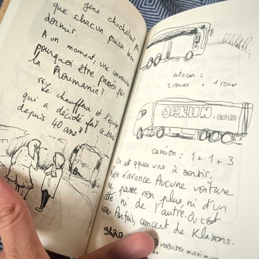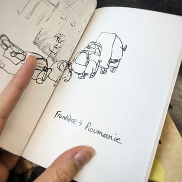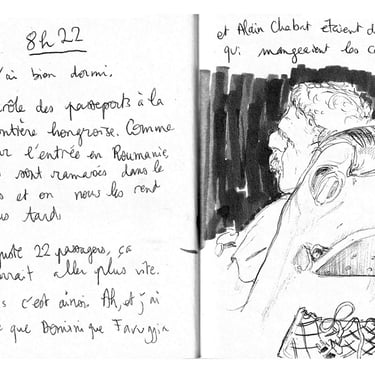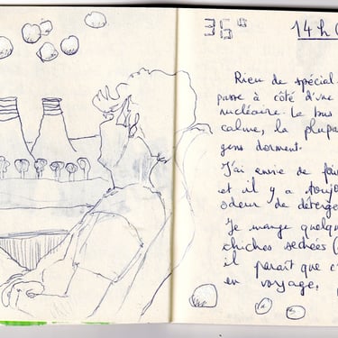 The book reproduces this notebook exactly. It combines diary and drawing, reflecting movement, boredom, encounters, the magic of travel, and the ordinary trivial nature of hours passing.
